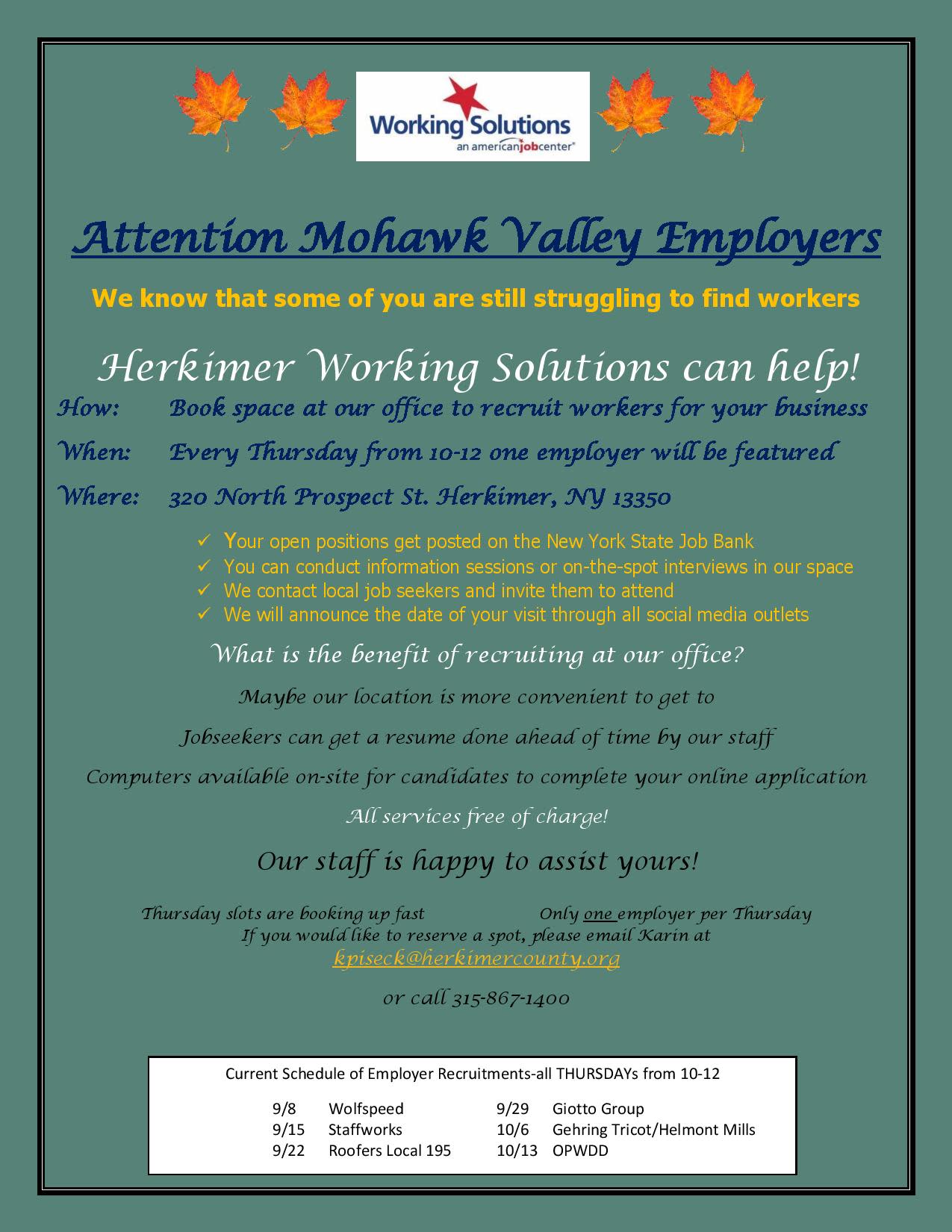In an effort to assist local businesses in connecting with job seekers, the Herkimer Working Solutions office has started a new initiative. Traditional job fairs have not been yielding great results since the pandemic and we read stories from across the nation and locally about employers needing workers. Starting now, we will highlight one employer each week to be on-site at our office on Thursdays from 10-12. We will share the employer’s name, open job titles and qualifications in the week leading up to their visit to get the word out to our local workforce. In addition, people who do not have a resume ready to go, can contact our office ahead of time to make an appointment to work with our staff to create one. We are hoping that this might help!