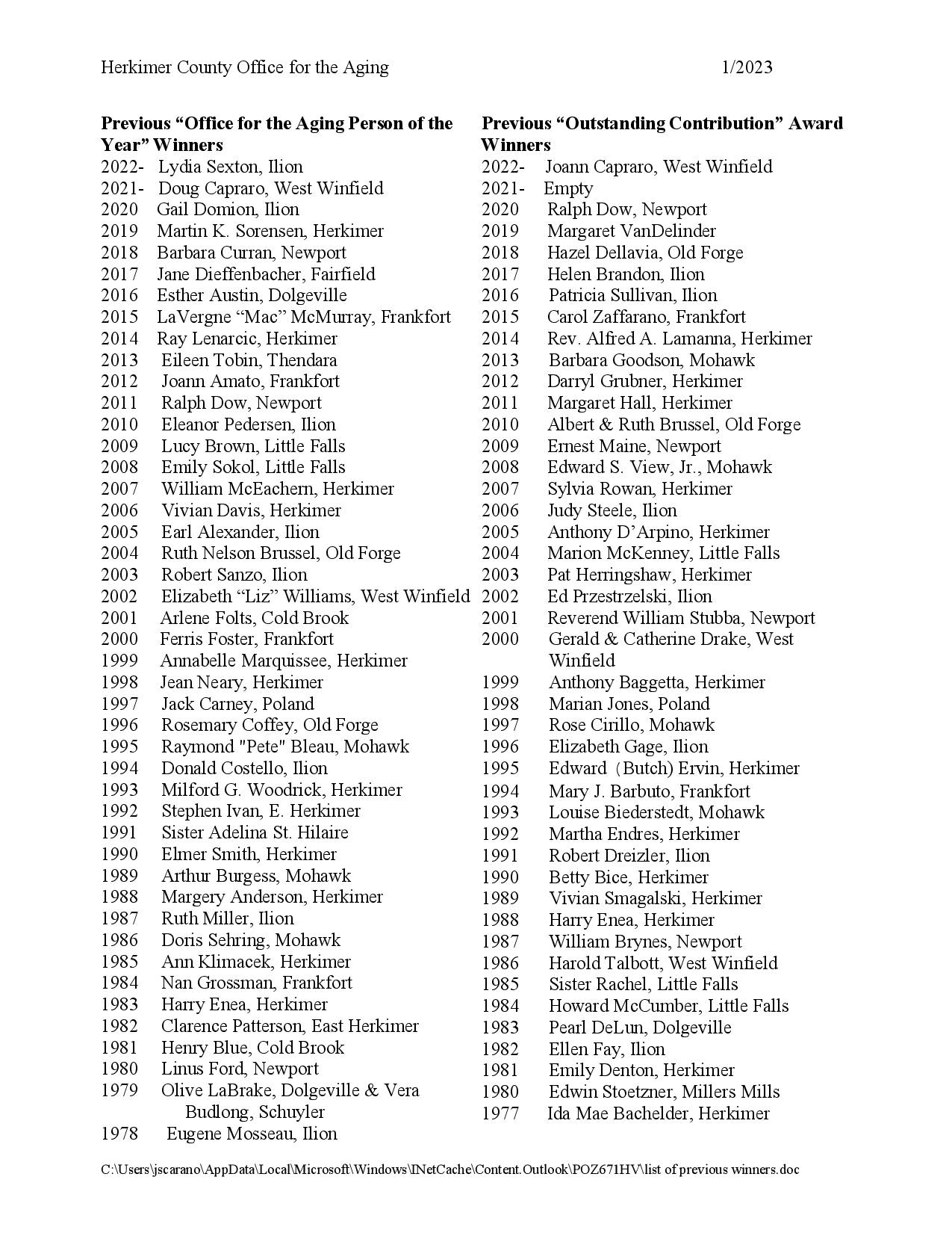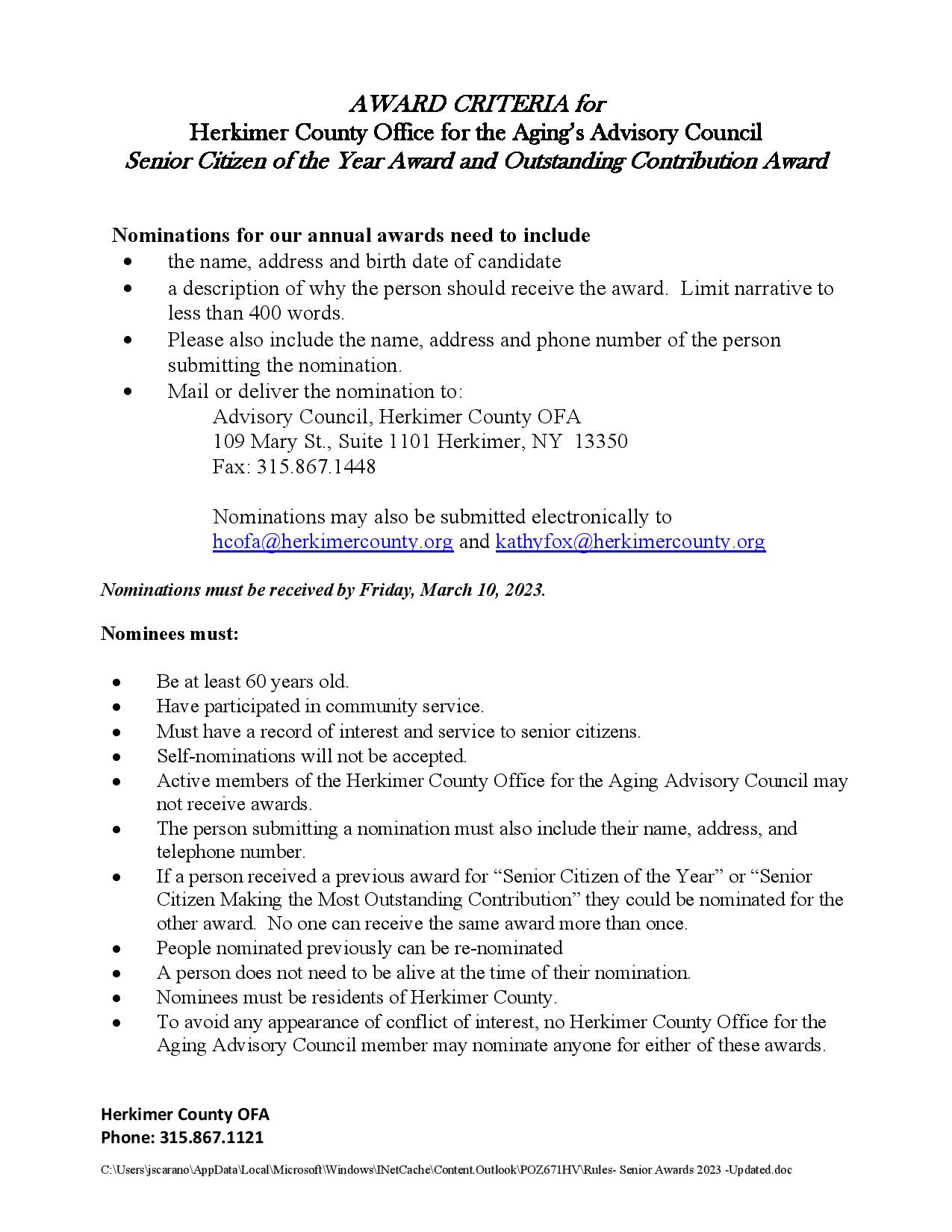 Office for the Aging Person of the Year award nomination information is also available at our web site; please see www.herkimercounty.org, then ‘Departments’, then ‘Office for the Aging’, then ‘Annual Awards.’